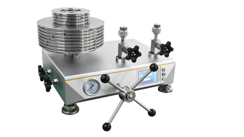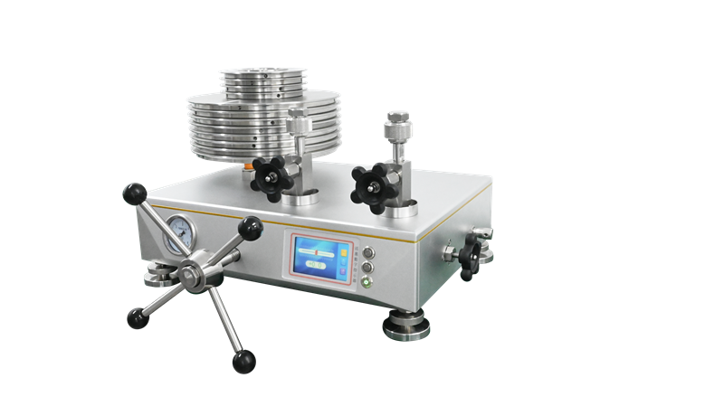 氣體活塞式壓力計(jì),是利用流體靜力平衡(即作用在活塞有效面積上的流體壓力與其所負(fù)荷的重力相平衡)原理進(jìn)行壓力測(cè)量的計(jì)量器具,一般由活塞系統(tǒng)、專用砝碼、壓力校驗(yàn)器組成,另外還需配備相應(yīng)的氣源或自帶壓力泵。其量程為:-100kPa~0kPa~600kPa