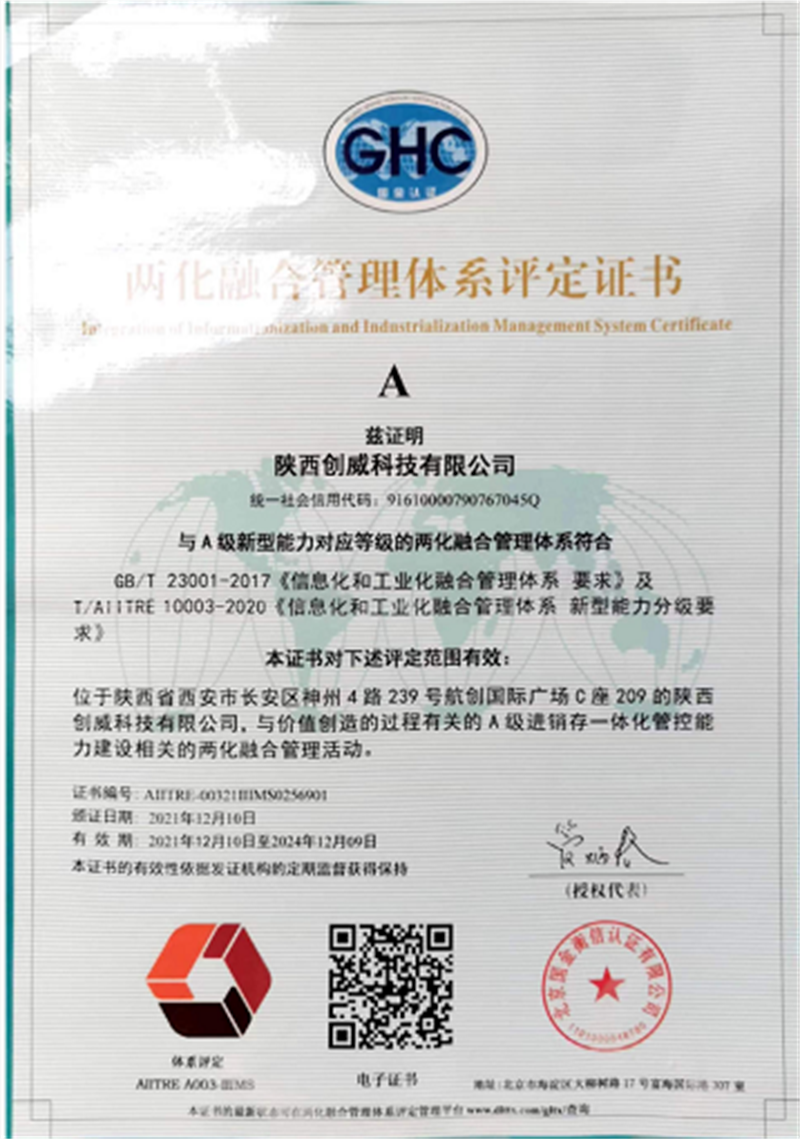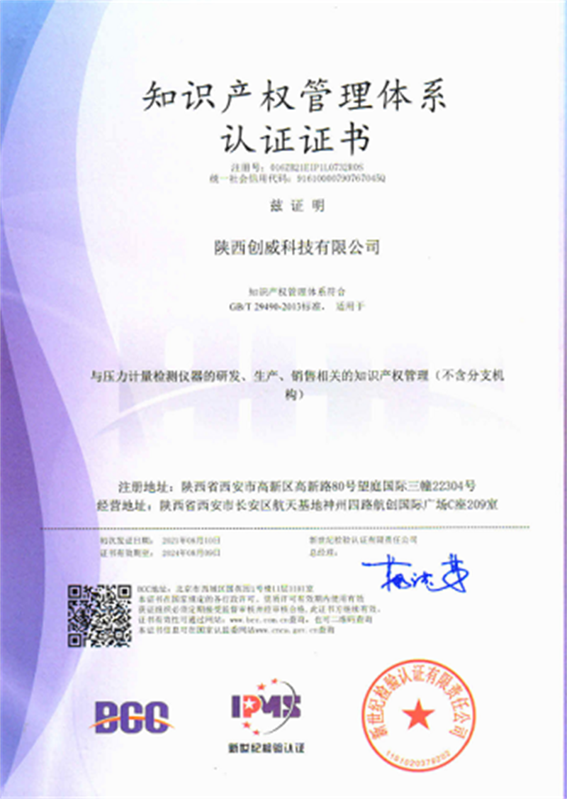 10月,創(chuàng)威科技通過了兩化融合管理體系評(píng)定的復(fù)審,獲得了“兩化融合管理體系評(píng)定證書”,此項(xiàng)證書的頒發(fā)證明了陜西創(chuàng)威科技有限公司符合A級(jí)新型能力對(duì)應(yīng)等級(jí)的兩化融合管理體系。與此同時(shí),榮獲“知識(shí)產(chǎn)權(quán)管理體系認(rèn)證證書”,該項(xiàng)證書進(jìn)一步確立了創(chuàng)威科技在壓力計(jì)量檢測(cè)儀器的研發(fā)、生產(chǎn)、銷售相關(guān)的知識(shí)產(chǎn)權(quán)管理等方面的權(quán)利。