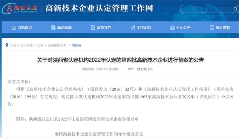 12月16日,全國高新技術(shù)企業(yè)認(rèn)定管理工作領(lǐng)導(dǎo)小組辦公室發(fā)布公告,公示了包括陜西創(chuàng)威科技有限公司在內(nèi)的陜西省認(rèn)定機(jī)構(gòu)2022年認(rèn)定的第四批1563家高新技術(shù)企業(yè)備案名單。這是繼2019年11月7日之后創(chuàng)威科技再一次獲得了此項(xiàng)證書,進(jìn)一步確立了創(chuàng)威科技一直處于高新技術(shù)發(fā)展的前沿地位,堅(jiān)定了向科技領(lǐng)先方向發(fā)展的決心!