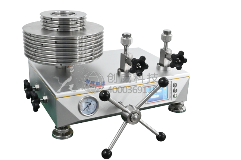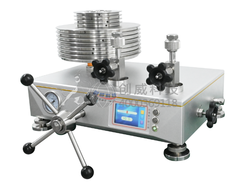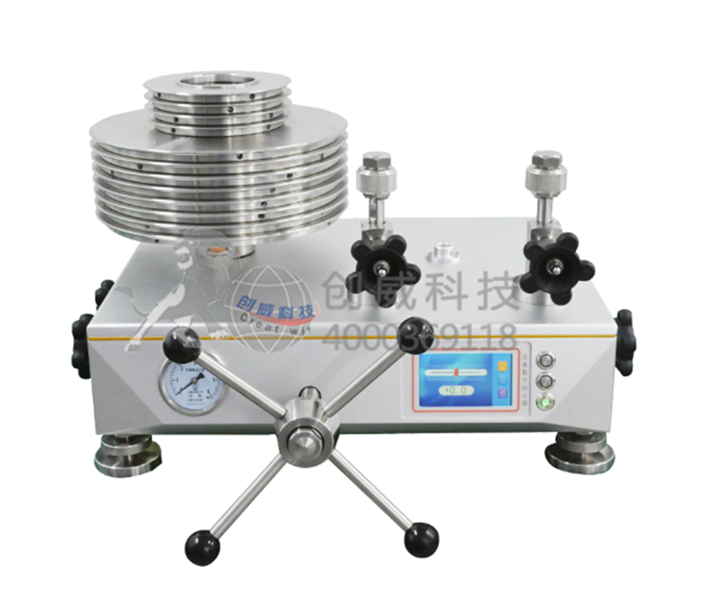 ●兩個(gè)被檢表接頭處設(shè)計(jì)有兩個(gè)截止閥,截止閥能及時(shí)關(guān)閉被檢系統(tǒng)之間的壓力。由于活塞式壓力計(jì)在加減砝碼時(shí),需要減壓將活塞降下來(lái),而被檢精密壓力表、壓力變送器、傳感器等和系統(tǒng)之間若不能被截止,表中的壓力會(huì)隨著活塞升降而升降,則考核不出被檢表的回程誤差,特意設(shè)計(jì)的壓力轉(zhuǎn)換閥,在關(guān)閉時(shí),可不用砝碼單獨(dú)工作,即活塞壓力計(jì)臺(tái)子可作為壓力泵或壓力源獨(dú)立使用。